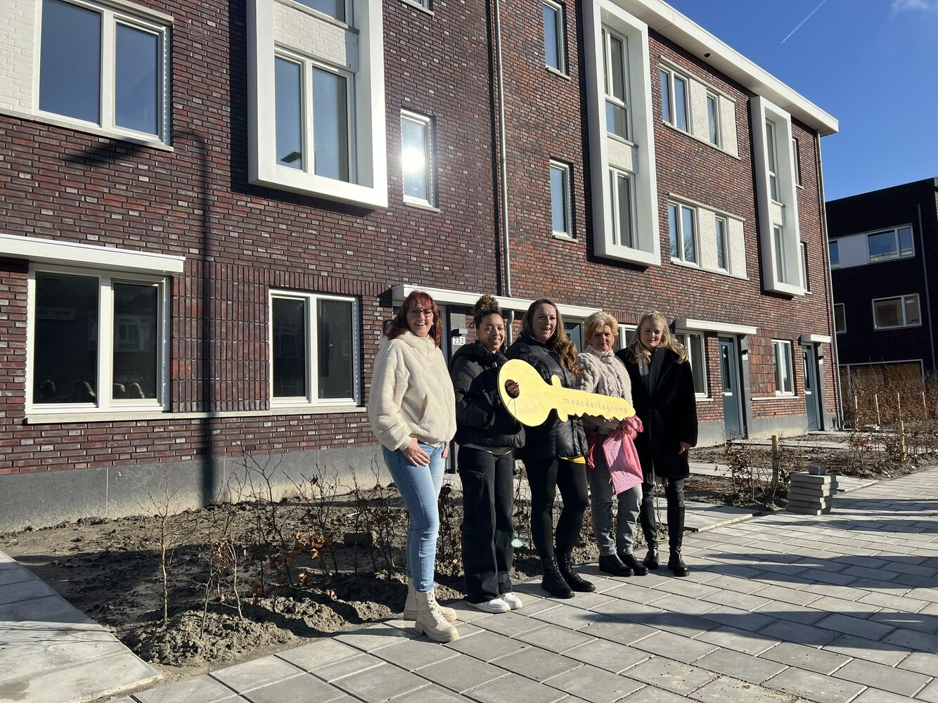 De woonconsulentes Elmira en Yvonne waren er om de sleutels uit te reiken aan de huurders. “Het zijn erg mooie woningen geworden. En het is altijd leuk om de ‘eerste’ sleutel uit te reiken aan de nieuwe huurders”. Voor Yvonne is deze sleuteluitreiking extra bijzonder. Want dit is 1 van haar laatste klussen voordat ze met vroegpensioen gaat. “Wij wensen alle huurders veel succes met de verhuizen en veel woonplezier in hun nieuwe woning”.
